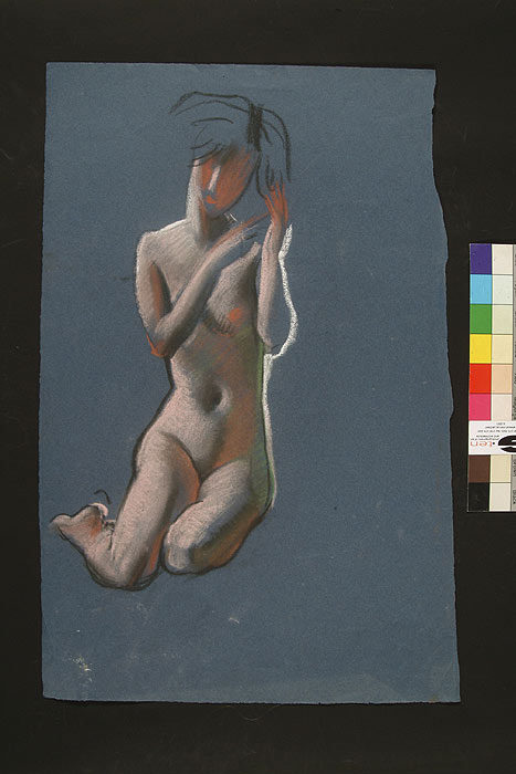 | Title: Study of knees for The Model's Throne, 1940 Date: 1932 or 1940 Size: 261 mm x 204 mm Medium: Pencil, coloured crayon Support: Bank [ref 1] [new window] Watermark: None Signature: None Annotations: Name, address and telephone number in pencil top left corner Description: Study of knees Condition: Fair, creased, stains Notes: None Related images: 243, 259, 260, 261, 264, 334, 339, 757, 759r, 759v, 785 [new window] Ref: 334 Detail: |
